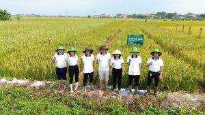 Anh Trần Văn Thanh cùng các cán bộ của Trung tâm Khảo kiểm nghiệm phân bón Quốc gia tại mô hình khảo nghiệm ở huyện Bình Xuyên, tỉnh Vĩnh Phúc. Ảnh: Hùng Khang.